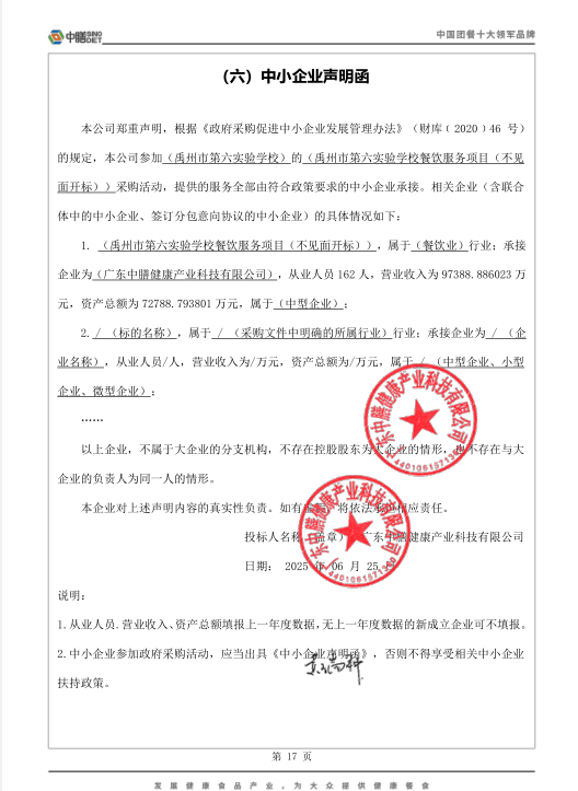 1 | 禹州市第六实验学校餐饮服务项目 | 详见 附件 | 详见 附件 | 服务期1年(期满考核,合格可以续约四次) | 符合国家相关法律规定及现行行业标准与规范的要求,并满足采购人要求 | ||