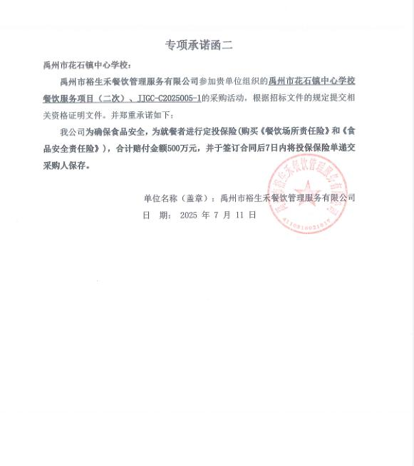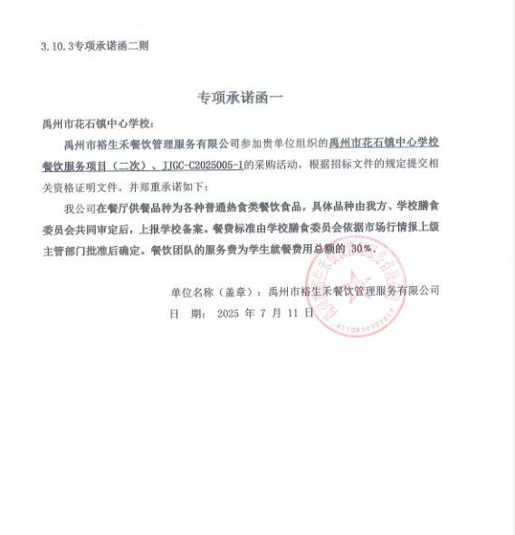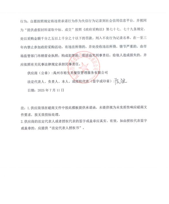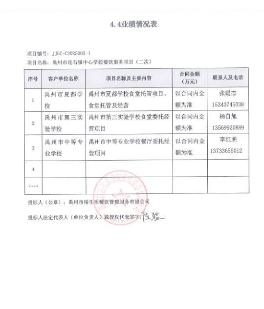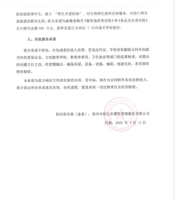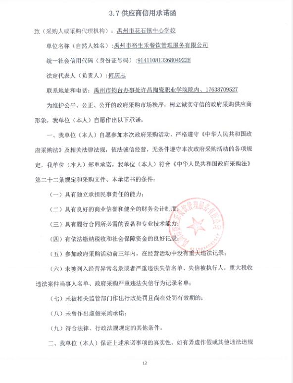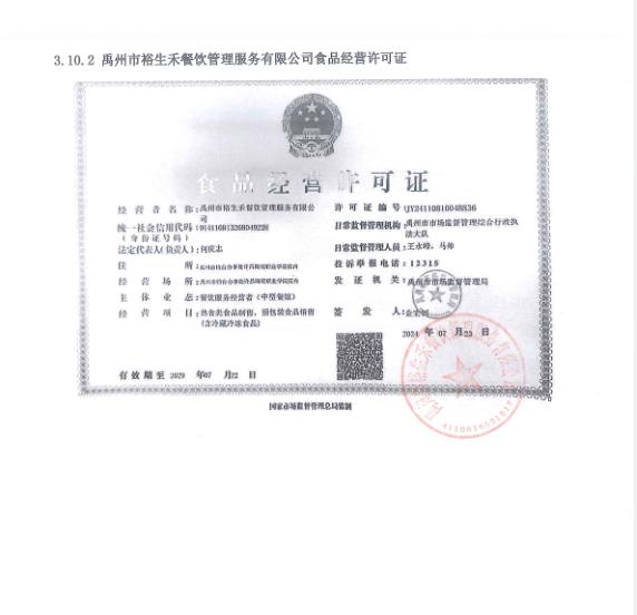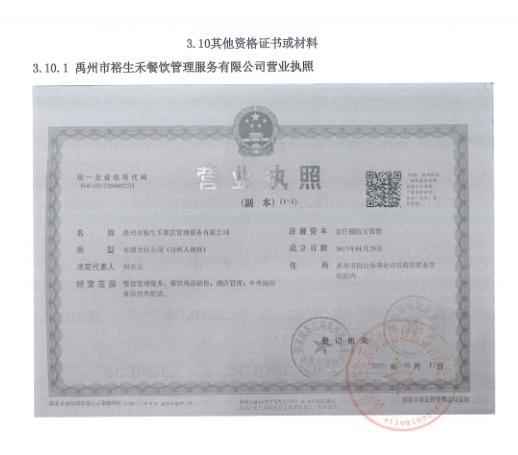 第一成交候选人:禹州市裕生禾餐饮管理服务有限公司
