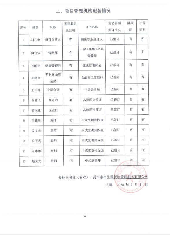 2 | 禹州市裕生禾餐饮管理服务有限公司 | 服务期1年(期满考核,合格可以续约,最多可续约四次),每年对服务商考核,考核合格后,续约合同;考核不合格,自动终止合同。如合同执行期间与国家、省市政策或规定不符,按国家、省市相应政策执行 | 密封完好 |