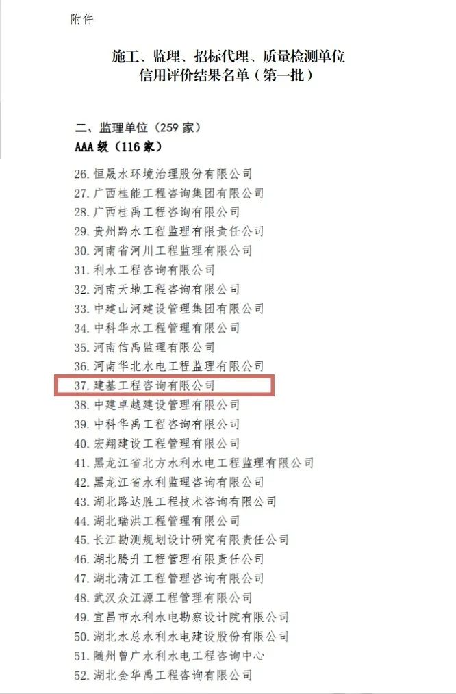 2024年1月19日,中国水利工程协会公示了《关于2023年度水利建设市场主体(施工、监理、招标代理、质量检测单位)信用评价结果的公告(第一批)》。公司荣获AAA信用等级,这一荣誉的获得,不仅是对公司多年来诚信经营的肯定,更是对其在水利工程建设监理领域专业能力的认可。