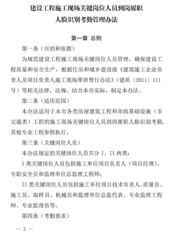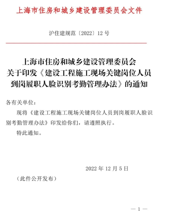 近日,上海市住建委印发《建设工程施工现场关键岗位人员到岗履职人脸识别考勤管理办法》,自发布之日起施行。