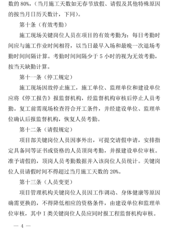 施工现场关键岗位人员考勤月到岗率不得低于当月施工天数的80%,(当月施工天数如无春节放假、请假及其他特殊原因的按当月日历天数计,下同)。