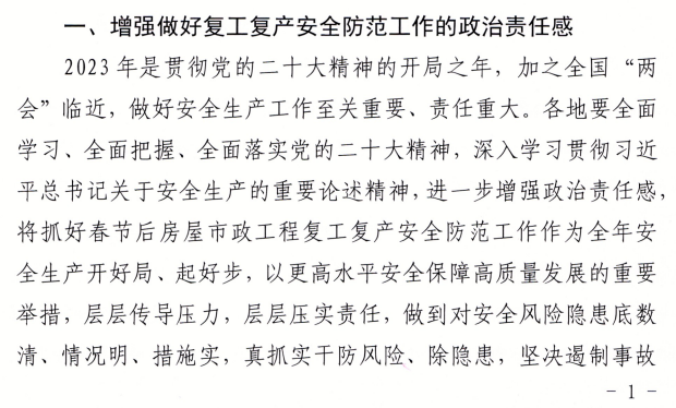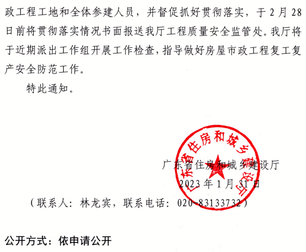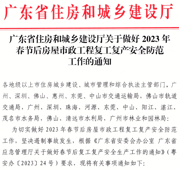 近日,广东省住建厅发布《广东住建厅关于做好2023年春节后房屋市政工程复工复产安全防范工作的通知》。