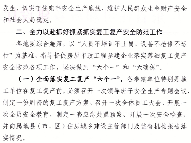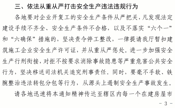各地要对企业开复工的安全生产条件从严把关,凡发现法定建设手续不齐全、安全生产条件不合格,以及不落实“六个一”和“六确保”措施的,坚决责令停工整改,一律提请我厅暂扣建筑施工企业安全生产许可证,并从重从严惩处。