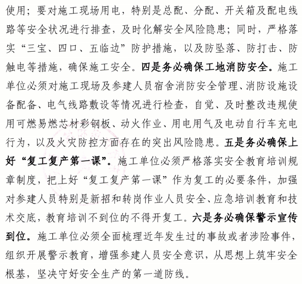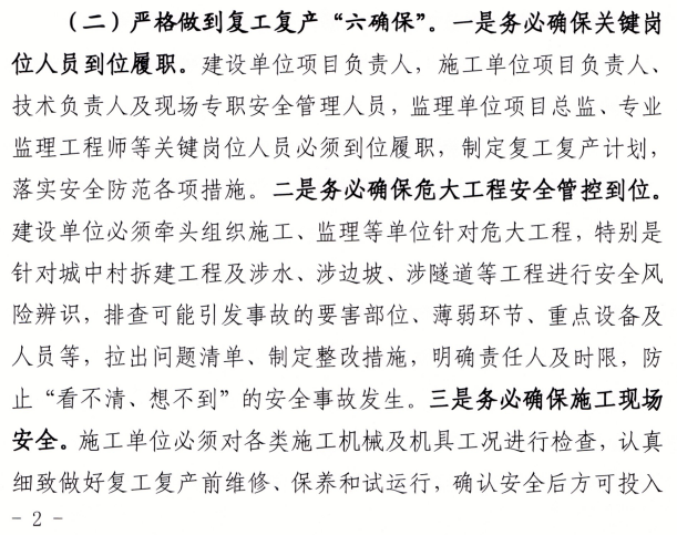 建设单位项目负责人,施工单位项目负责人、技术负责人及现场专职安全管理人员,监理单位项目总监、专业监理工程师等关键岗位人员必须到位履职,制定复工复产计划,落实安全防范各项措施。
