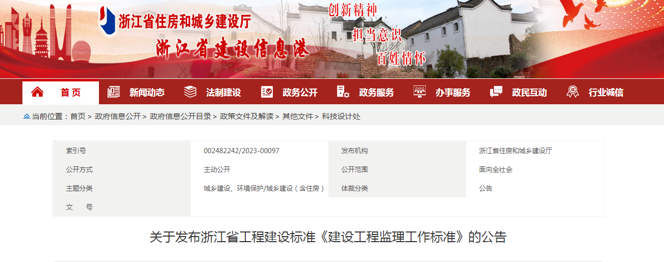 关于发布浙江省工程建设标准《建设工程监理工作标准》的公告