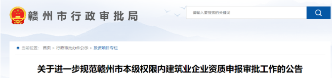 12月1日,赣州市行政审批局发布《关于进一步规范赣州市本级权限内建筑业企业资质申报审批工作的公告》,提出:
